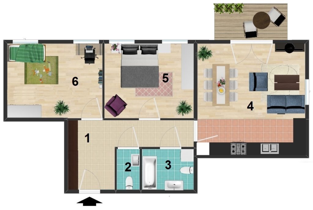 Rzut lokalu przedstawia przykładową aranżację wnętrza.